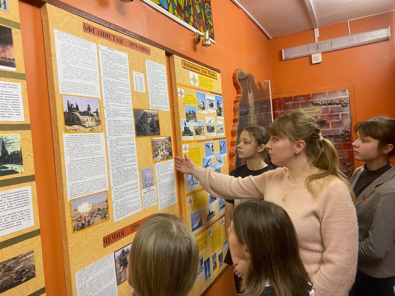 В школьном музее побывали учащиеся 5-го класса. В музее один из стендов посвящен выпускникам и односельчанам, принимавшим участие в войне в Афганистане.