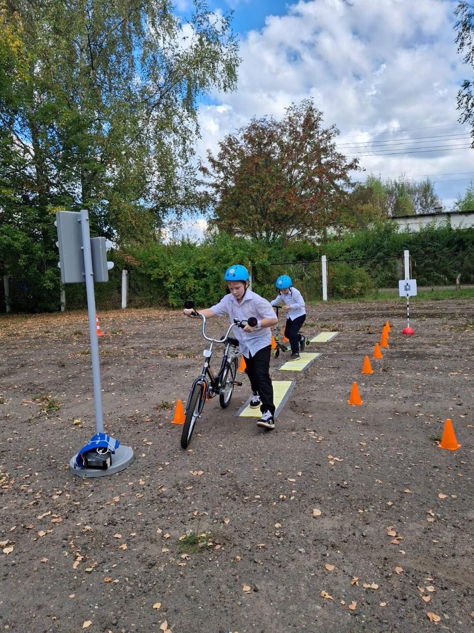 На школьной площадке развернулась настоящая трасса для маневрирования на велосипедах и самокатах.
