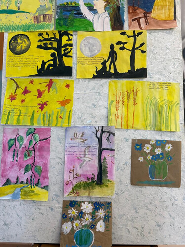 На уроке изобразительного искусства ребята нарисовали рисунки по произведениям Есенина, на каждом рисунке - строчки из стихотворения. В библиотеке организована выставка книг. Такие мероприятия дают возможность глубже понять творчество Сергея Александровича Есенина, ощутить красоту его поэзии, прикоснуться к истории России через призму его стихов.