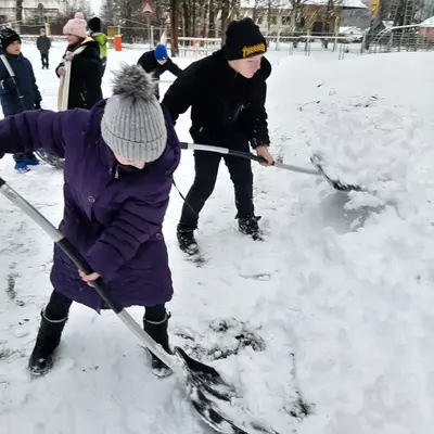 Участие в уборке территории школы и двора — школьники охотно берутся за лопаты и метлы, поддерживая чистоту и порядок возле учебного заведения и дома вместе с родителями.