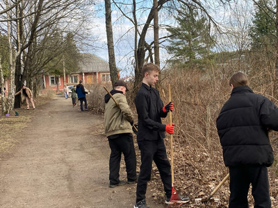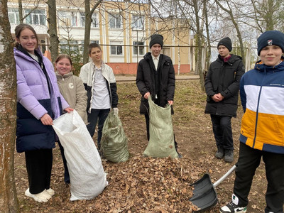 Все учащиеся и учителя вместе вышли на улицу. Собирали мусор, подметали дорожки, убирали сухую траву и листья. Работали дружно, помогая друг другу!